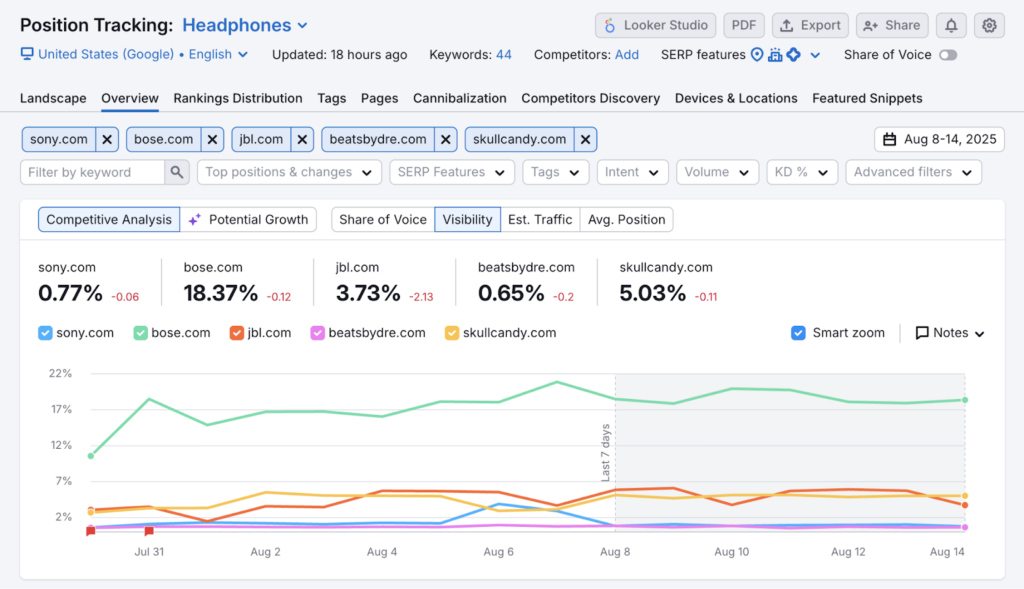 In Semrush, search visibility is best determined using Position Tracking’s Visibility %, monitored over time and broken down by keyword groups, pages, and competitors.